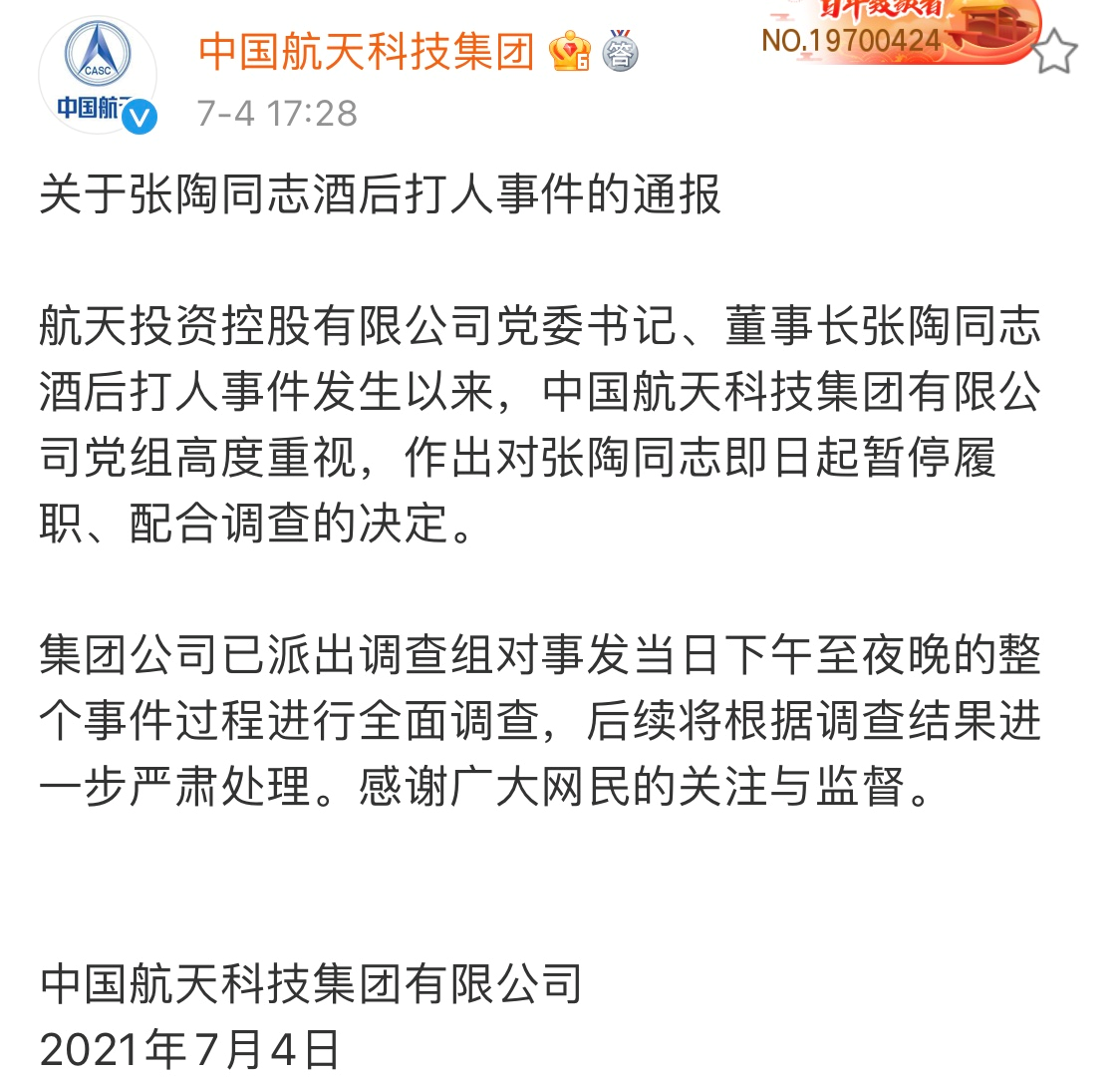 7月4日,中国航天科技集团有限公司发布通报称,张陶即日起暂停履职、配合调查。