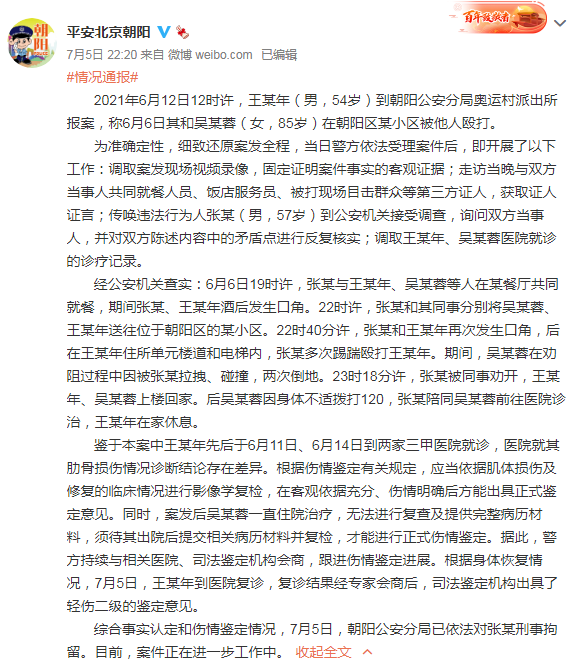 2021年7月19日,北京市朝阳区人民检察院经依法审查,对犯罪嫌疑人张陶(男,57岁,本市海淀区人,案发前任航天投资控股有限公司党委书记、董事长)以涉嫌故意伤害罪批准逮捕。