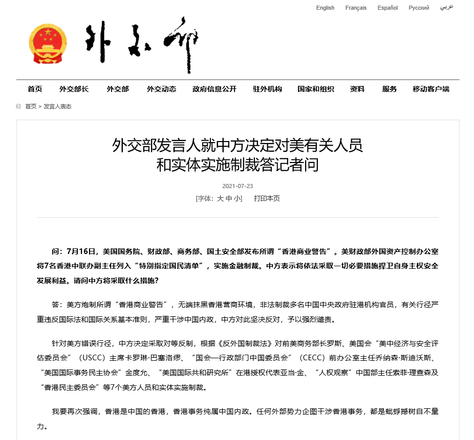 7月23日,外交部发言人就中方决定对美有关人员和实体实施制裁答记者问。发言人指出,针对美方错误行径,中方决定采取对等反制,根据《反外国制裁法》对7个美方人员和实体实施制裁。