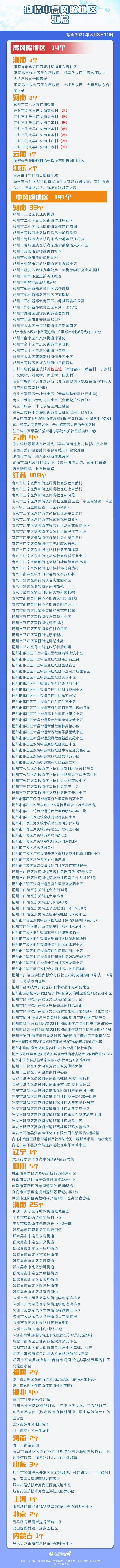 截至8月8日11时,全国有14个高风险地区,191个中风险地区。