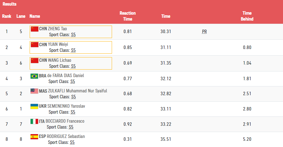 9月1日,在东京残奥会游泳男子50米自由泳S5级决赛中,三名中国选手发挥出色,郑涛游出30秒31,打破残奥会纪录,夺得金牌!袁伟译、王李超分获二、三名,中国代表团包揽该项目金银铜牌!