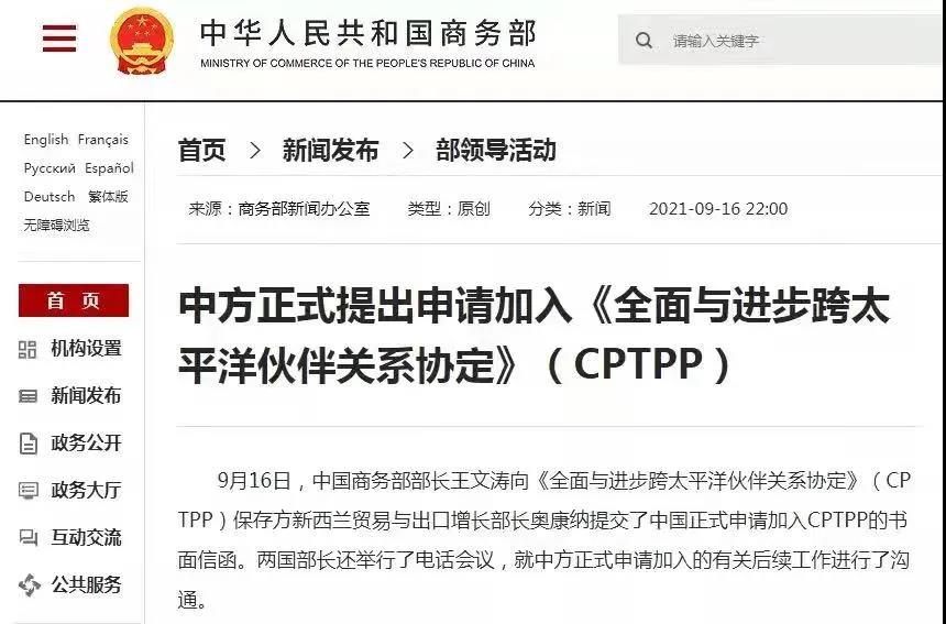 据商务部消息,9月16日,中国商务部部长王文涛向《全面与进步跨太平洋伙伴关系协定》(CPTPP)保存方新西兰贸易与出口增长部长奥康纳提交了中国正式申请加入CPTPP的书面信函。两国部长还举行了电话会议,就中方正式申请加入的有关后续工作进行了沟通。
