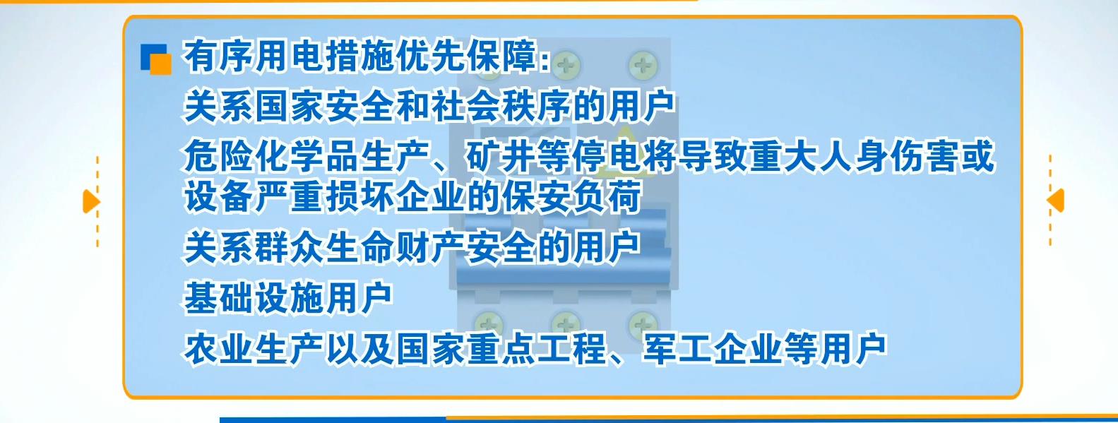 有序用电措施优先保障关系国家安全和社会秩序的用户,危险化学品生产、矿井等停电将导致重大人身伤害或设备严重损坏企业的保安负荷,关系群众生命财产安全的用户,基础设施用户,农业生产以及国家重点工程、军工企业等用户的用电。同时,重点限制违规建成或在建项目,产业结构调整目录中淘汰类、限制类企业,单位产品能耗高于国家或地方强制性能耗限额标准的企业,景观照明、亮化工程及其他高耗能、高排放企业的用电。