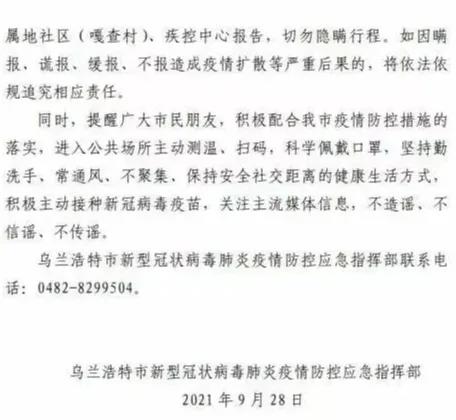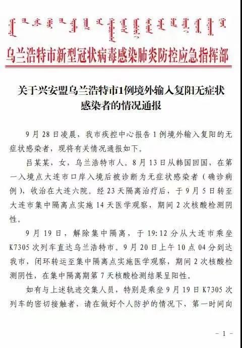 9月28日,兴安盟新冠肺炎疫情防控指挥部发布公告,2021年9月27日,乌兰浩特市在对指定隔离点境外返盟被隔离人员例行核酸检测时发现一名复阳病例吕某,现将吕某的活动轨迹公告如下: