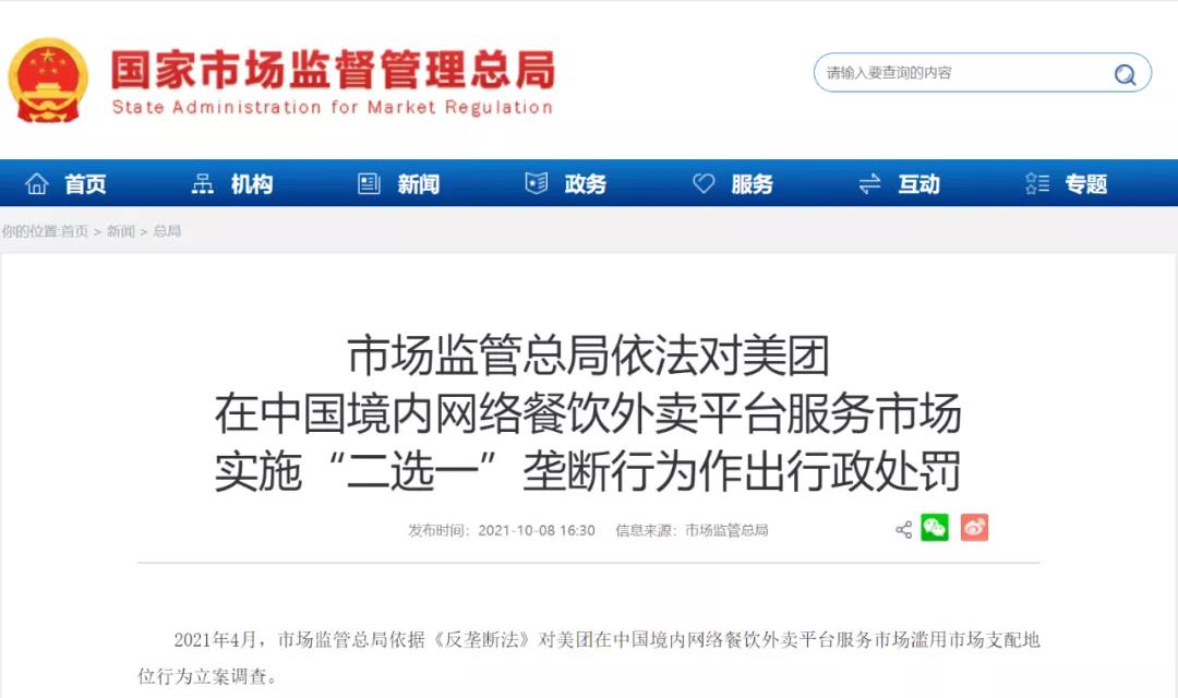 2021年4月,市场监管总局依据《中华人民共和国反垄断法》,对美团在中国境内网络餐饮外卖平台服务市场滥用市场支配地位行为立案调查。