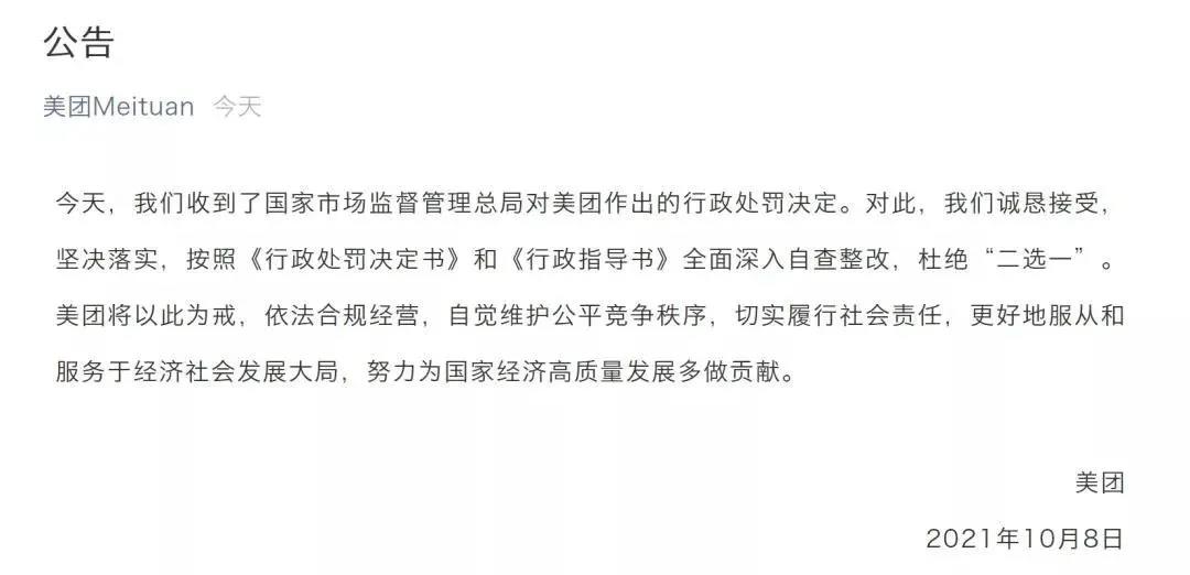 对此,美团官方发布公告回应表示,收到了国家市场监督管理总局对美团作出的行政处罚决定,并诚恳接受,坚决落实。