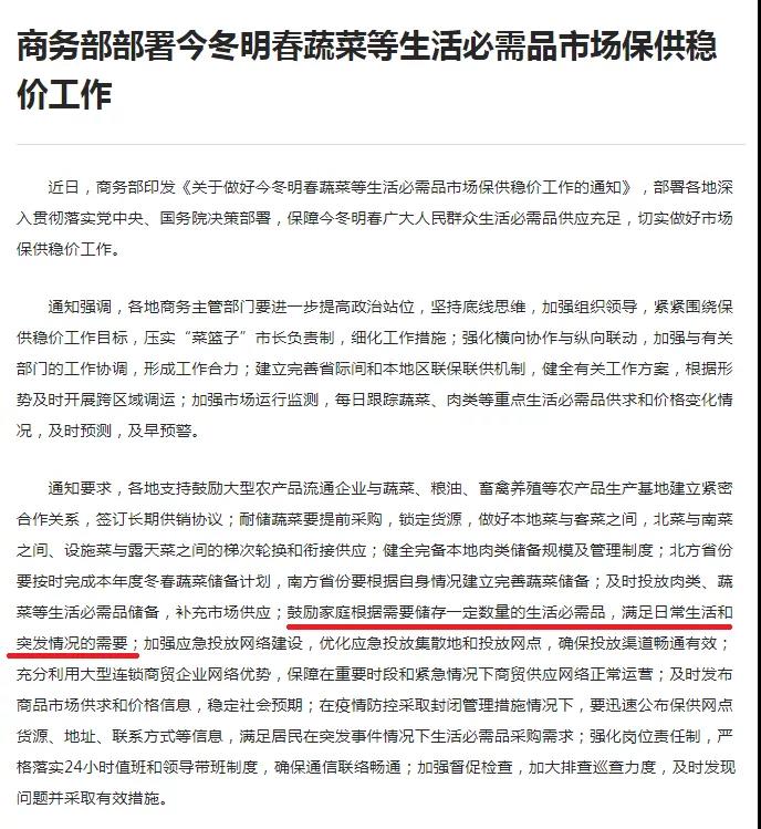 商务部近日印发的《关于做好今冬明春蔬菜等生活必需品市场保供稳价工作的通知》中提到,“鼓励家庭根据需要储存一定数量的生活必需品,满足日常生活和突发情况的需要”。一句话引出网友各种猜测,引起热切讨论。