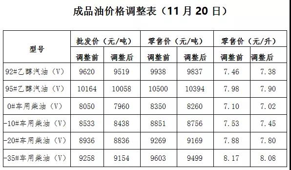 根据近期国际市场油价变化情况,按照现行成品油价格形成机制,自2021年11月19日24时起,国内汽、柴油价格(标准品)每吨分别降低95元和90元。调整后,相关部门要加大市场监督检查力度,严厉查处不执行国家价格政策的行为,维护正常市场秩序。