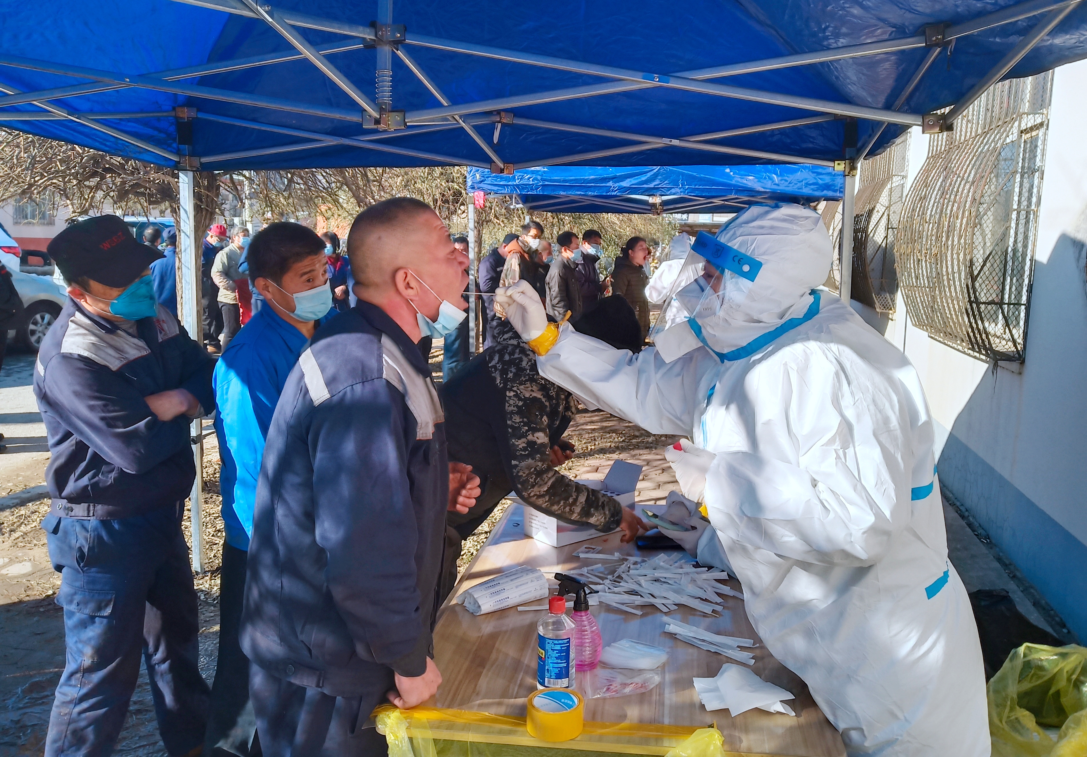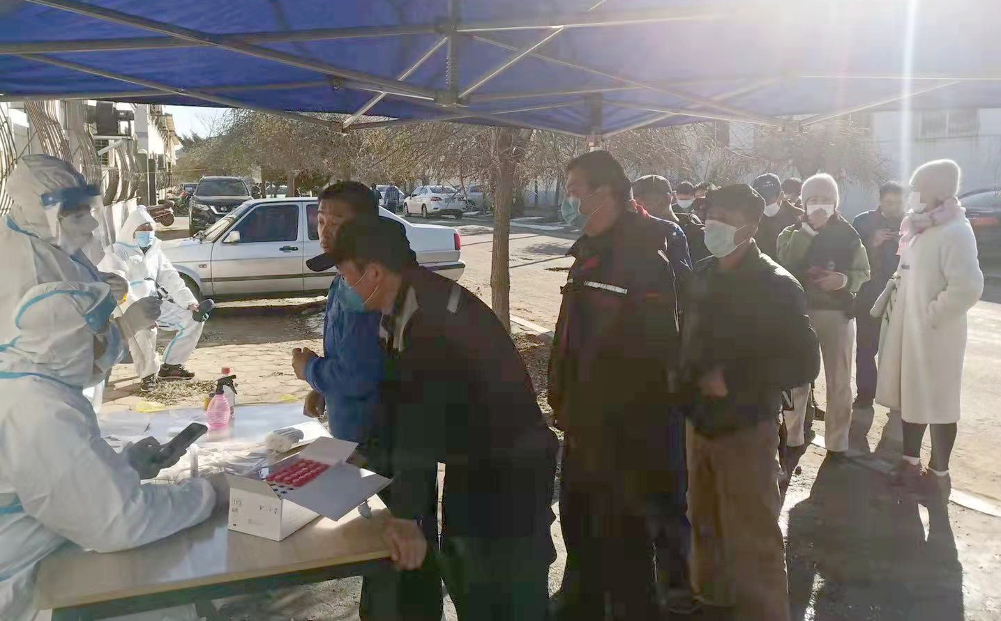 携手同心,这是一群美丽的逆行者。为了按时完成核酸采样工作,各个点位中午都不休息为市民采样。为了方便行动有困难的老人,护士钻进车里、蹲在地上、俯下身子采样。有时单腿跪在地上为孩子采样,连续重复的动作,腰酸背疼,在室外采集,手心冻得发凉。一直不厌其烦的重复着同样的话语,有的医护人员怕大爷大妈们听不见,特意提高声音、变慢语速,愣是把嗓子喊哑了。
