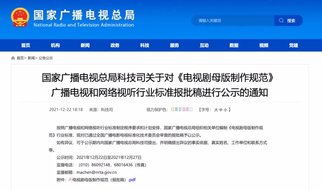 22日,国家广播电视总局在官网公示《电视剧母版制作规范》广播电视和网络视听行业标准报批稿。文件规定了高清、4K超高清电视剧母版制作要求,包括时长、署名、图像、声音、字幕、封装格式和技术质量的要求,并给出了声画质量主观评价方法。