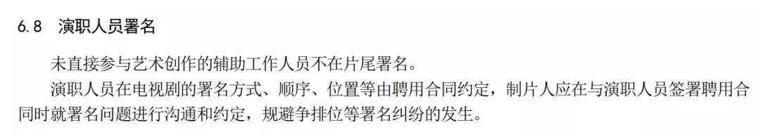 其中内容指出,演职人员在电视剧的署名方式、顺序、位置等由聘用合同约定,制片人应在与演职人员签署聘用合同时就署名问题进行沟通和约定,规避争排位等署名纠纷的发生。