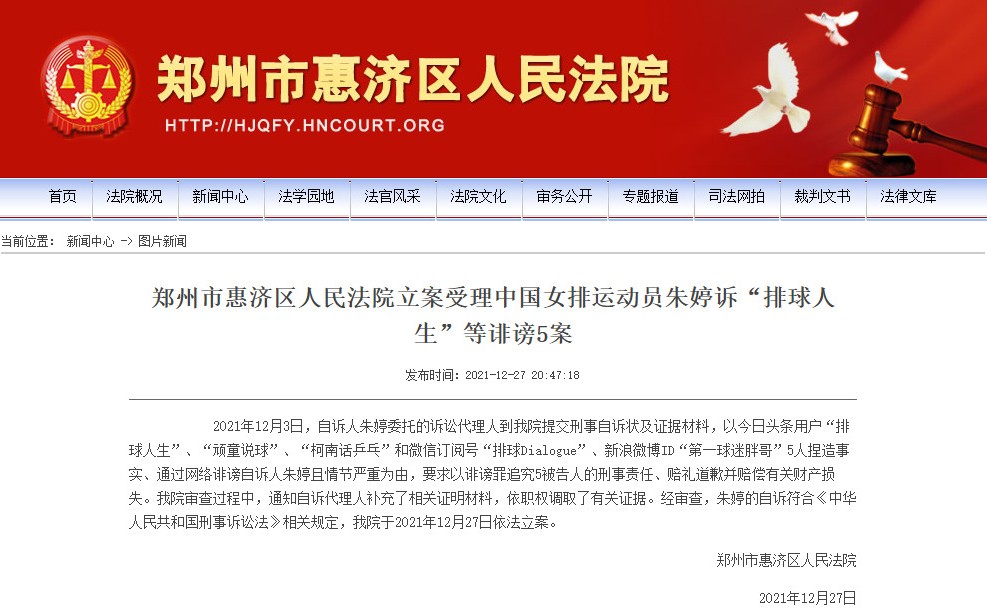 中国女排运动员朱婷称今日头条用户“排球人生”等5人捏造事实、通过网络对其诽谤,向法院提起刑事自诉。12月27日,河南省郑州市惠济区法院官网发布消息称,已依法立案。