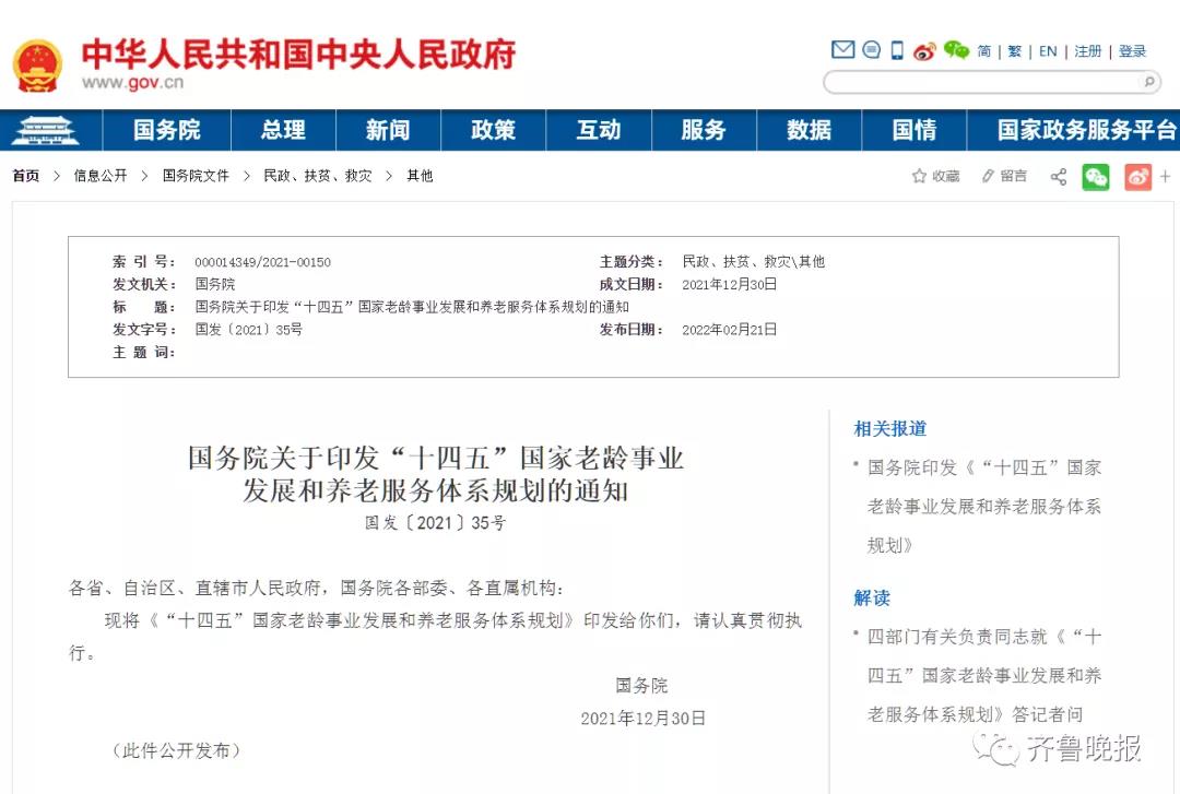 中国政府网21日刊发国务院关于印发“十四五”国家老龄事业发展和养老服务体系规划的通知,并公布规划全文。