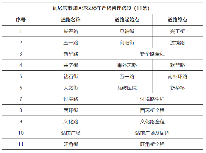 瓦房店市公安局交通警察大队为强化城市道路交通安全管理,提升道路通行能力,确保道路交通安全、顺畅、有序,自2022年8月16日起,将我市城区的长春路、五一路、新华路、共济街等11条主次干路确定为违法停车严格管理路段。