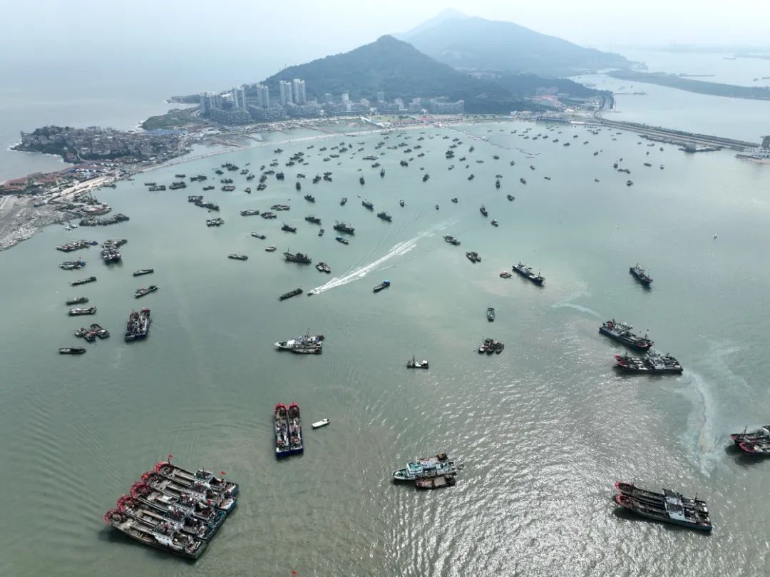 △9月4日,江苏连云港,众多渔船停泊在港湾避风。