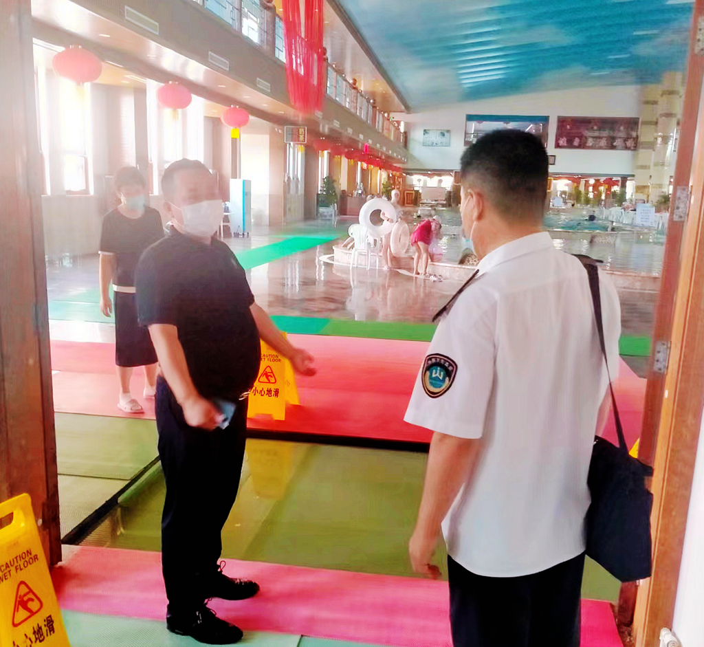 重点检查了疫情防控措施落实情况、卫生许可证和健康证持有公示情况,游泳池水循环过滤消毒、检测公示情况,浸脚消毒池设置使用和消毒剂使用检测公示情况,禁浴禁游标识设置情况,室内空气检测情况,公共用品用具洗刷消毒情况等。
