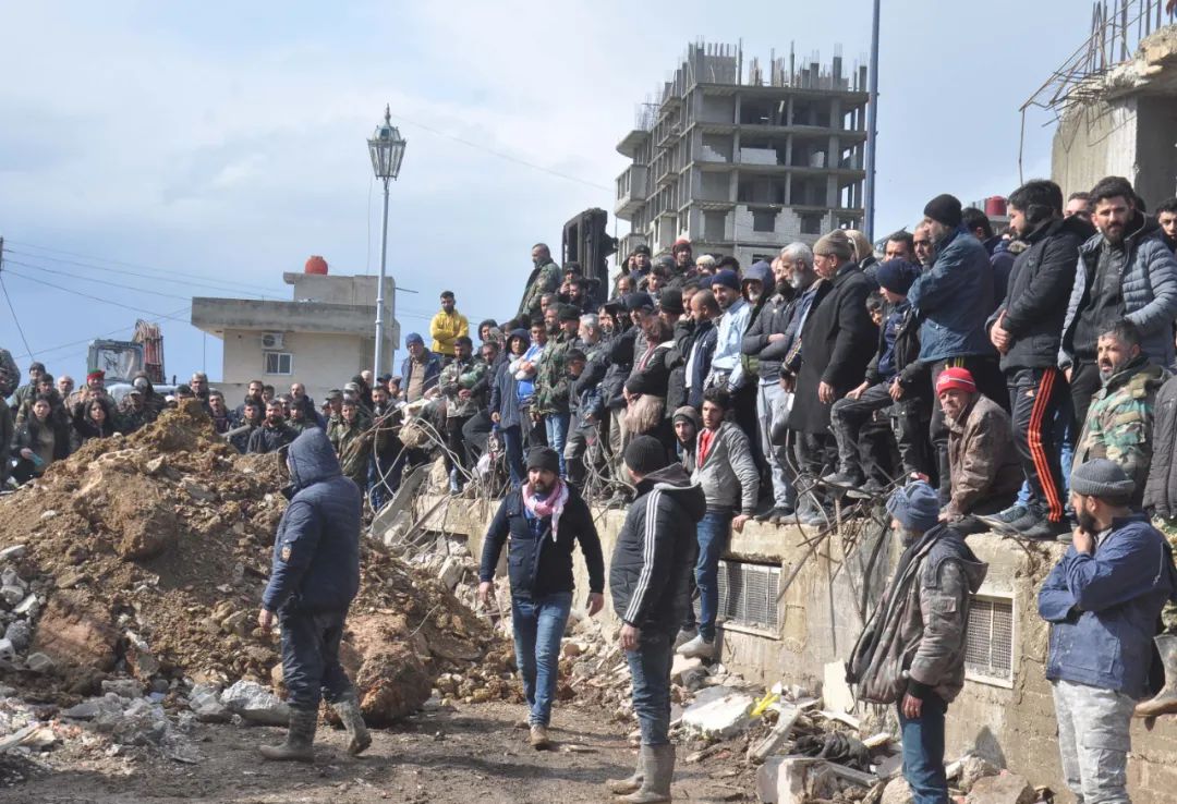 2月7日,人们在叙利亚拉塔基亚省的一处地震废墟参与搜救。新华社发
