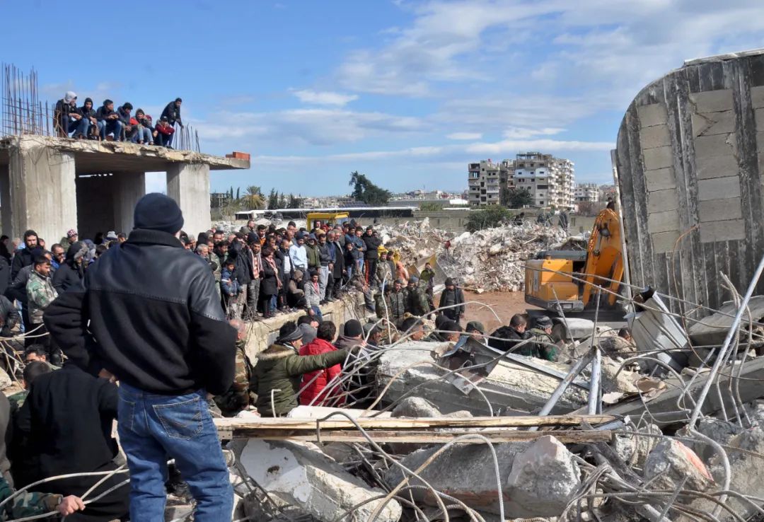 2月7日,人们聚集在叙利亚拉塔基亚省的一处地震废墟。新华社发