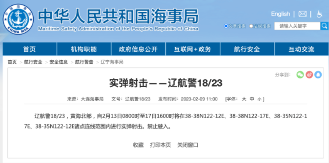 据中国海事局网站消息,大连海事局发布航行警告,自2月13日8时至17日16时,黄海北部部分海域进行实弹射击,禁止驶入。