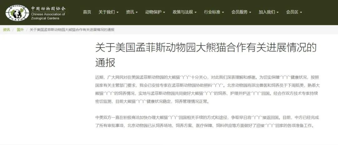 中国动物园协会网站发布通报称,为切实保障在美国孟菲斯动物园的大熊猫“丫丫”健康状况,按照国家有关主管部门要求,中国动物园协会已安排专家在孟菲斯动物园协助照料“丫丫”。北京动物园将派出兽医和饲养员于下周抵美,熟悉大熊猫“丫丫”的饲养情况,实地与孟菲斯动物园共同做好大熊猫“丫丫”的饲养、护理并护送“丫丫”回国。经合作双方技术专家持续密切监测,目前大熊猫“丫丫”健康状况稳定,饲养管理情况正常。