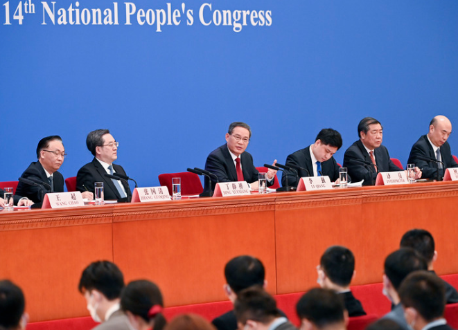 3月13日,十四届全国人大一次会议在北京人民大会堂举行记者会,国务院总理李强出席并回答中外记者提问。国务院副总理丁薛祥、何立峰、张国清、刘国中参加。新华社记者 岳月伟 摄