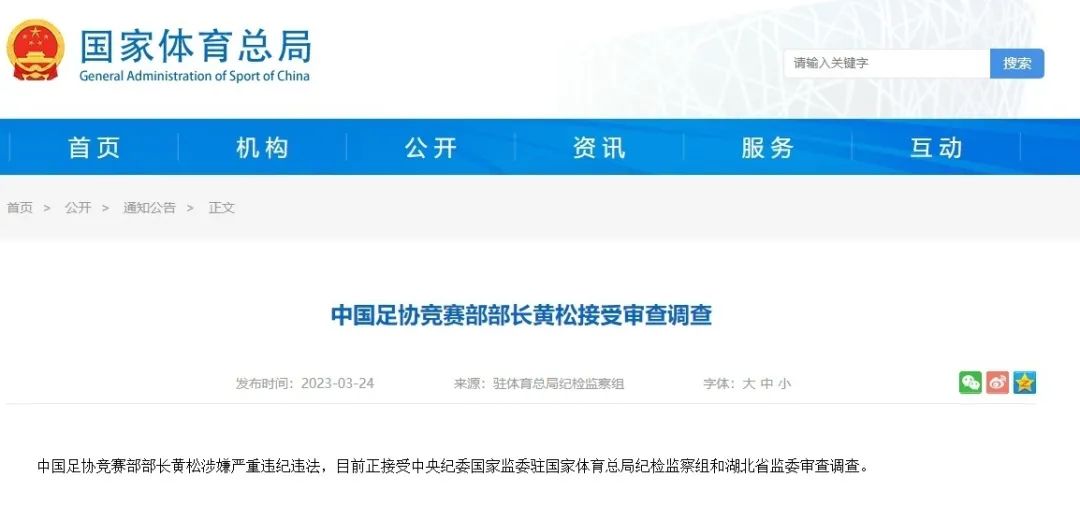 中国足协竞赛部部长黄松涉嫌严重违纪违法,目前正接受中央纪委国家监委驻国家体育总局纪检监察组和湖北省监委审查调查。