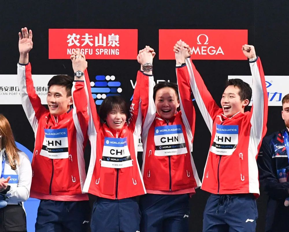 4月16日,中国队选手杨昊、陈芋汐、陈艺文、王宗源(从左至右)在颁奖仪式上。