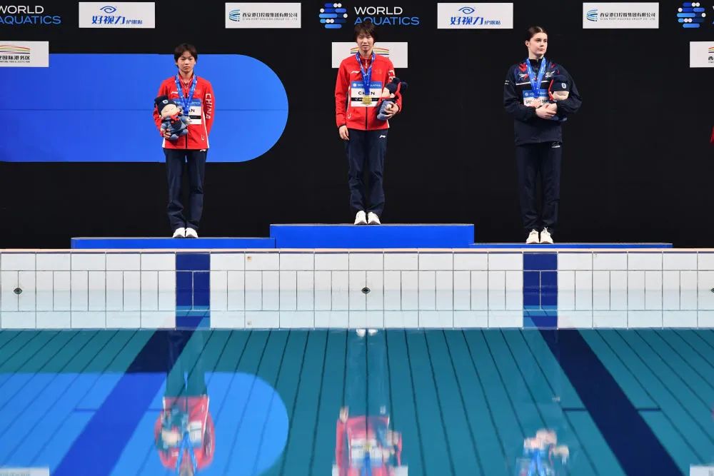 4月16日,冠军中国选手陈芋汐(中)、亚军中国选手全红婵(左)与季军英国选手西里埃在颁奖仪式上。