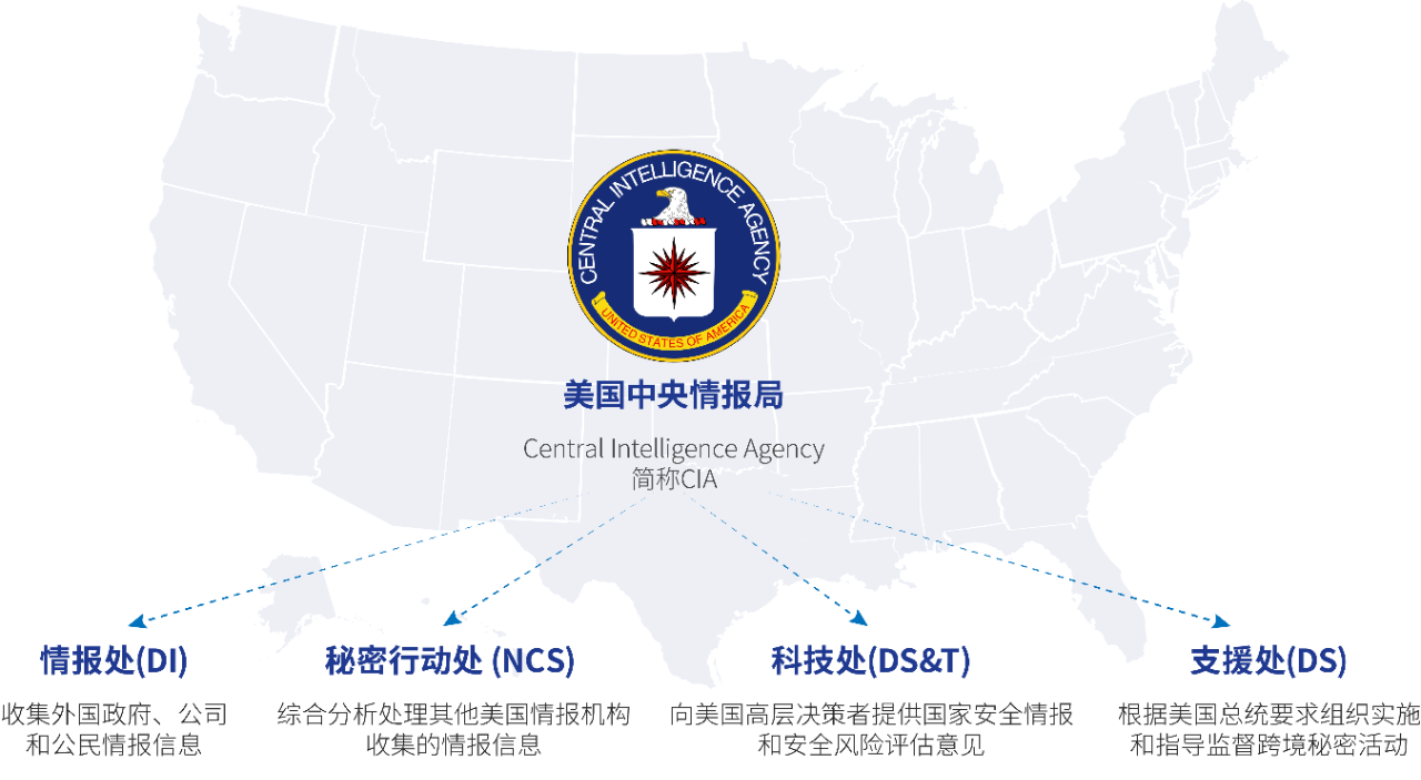CIA是美国联邦政府主要情报机构之一,总部位于美国弗吉尼亚州兰利,下设情报处(DI)、秘密行动处(NCS) 、科技处(DS&T)、支援处(DS)四个部门。其主要业务范围涉及:收集外国政府、公司和公民情报信息;综合分析处理其他美国情报机构收集的情报信息;向美国高层决策者提供国家安全情报和安全风险评估意见;根据美国总统要求组织实施和指导监督跨境秘密活动等。