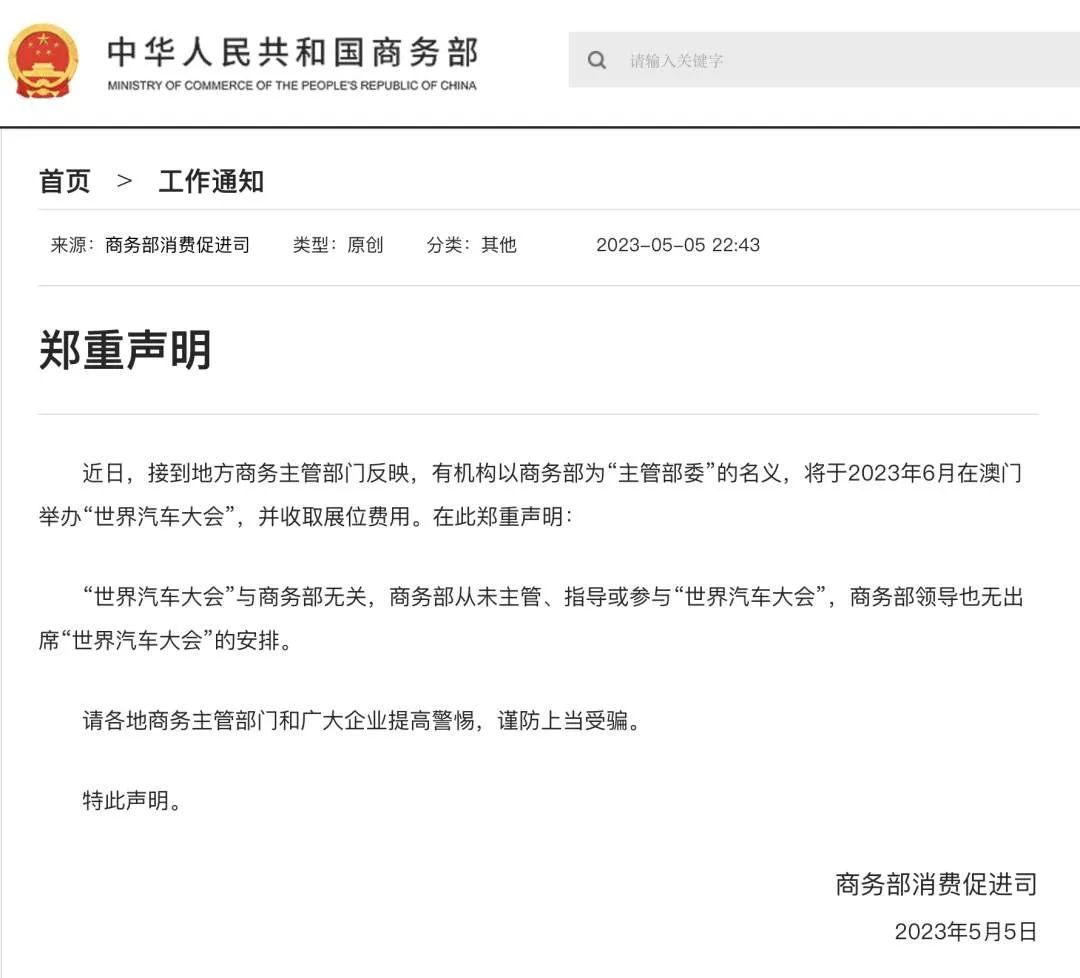 近日,接到地方商务主管部门反映,有机构以商务部为“主管部委”的名义,将于2023年6月在澳门举办“世界汽车大会”,并收取展位费用。在此郑重声明: