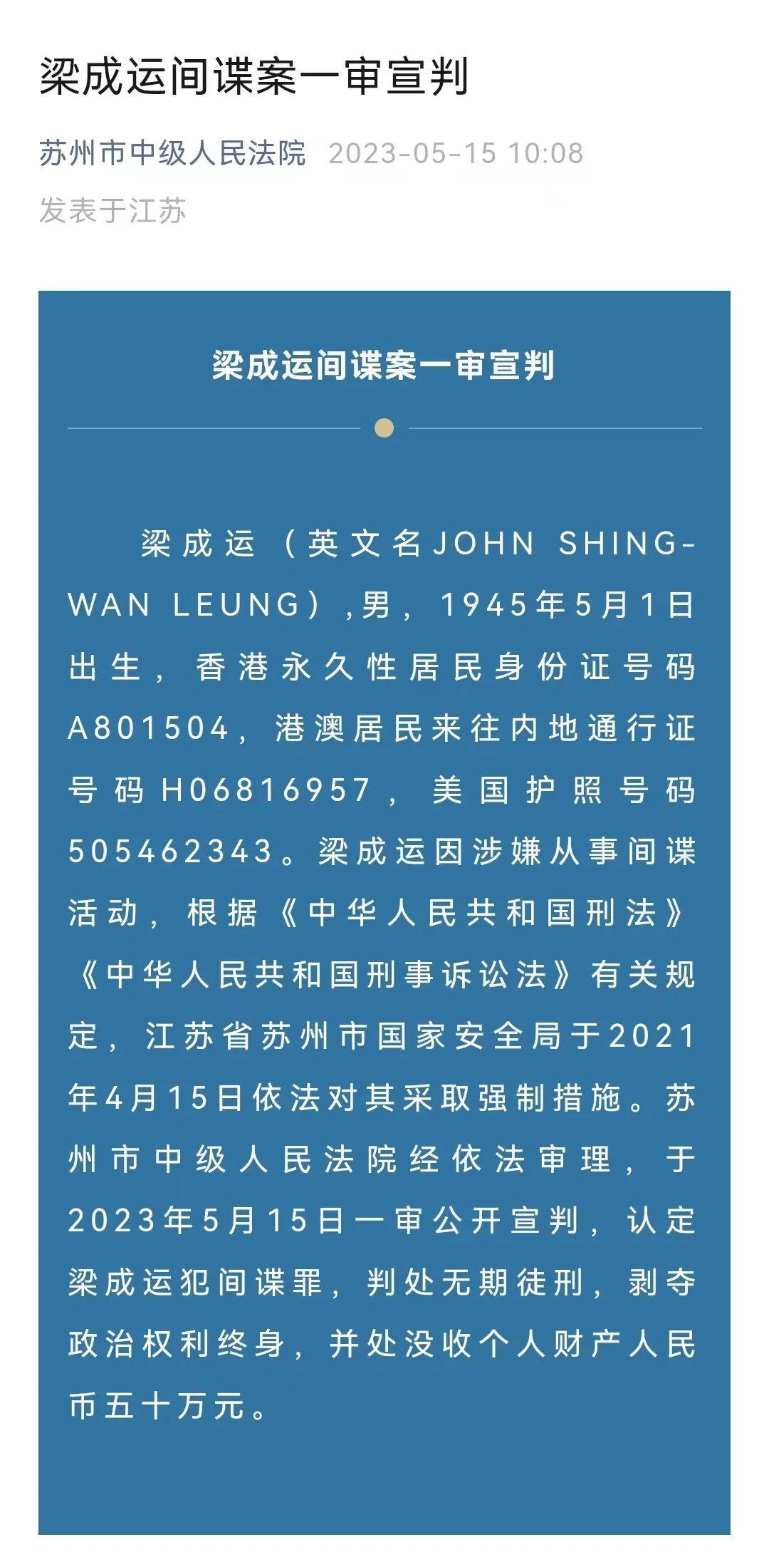 苏州市中级人民法院经依法审理,于2023年5月15日一审公开宣判,认定梁成运犯间谍罪,判处无期徒刑,剥夺政治权利终身,并处没收个人财产人民币五十万元。