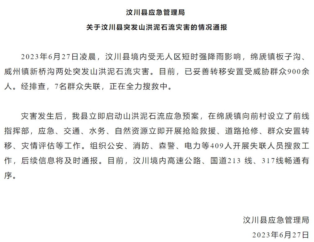 2023年6月27日凌晨,汶川县境内受无人区短时强降雨影响,绵虒镇板子沟、威州镇新桥沟两处突发山洪泥石流灾害。目前,已妥善转移安置受威胁群众900余人。经排查,7名群众失联,正在全力搜救中。