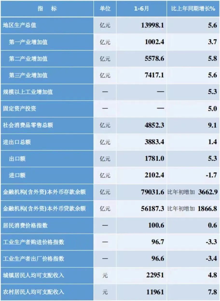 上半年,服务业增加值同比增长5.6%,增速比一季度提高2.2个百分点。一是批发和零售业稳定增长,增加值增长5.9%。二是住宿餐饮业强劲复苏,增加值增长20.5%。三是交通运输业较快增长,货运量82941.7万吨,增长8.3%;客运量13254.6万人,增长53.4%。四是商品房销售小幅下降,销售面积1110.0万平方米,下降1.7%。五是邮政业快速增长,邮政业务总量125.6亿元,增长16.1%。六是部分现代服务业增长较快,1-5月份互联网和相关服务、软件和信息技术服务业等现代服务业较快增长,营业收入分别增长18.0%、12.0%。