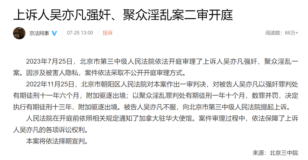 2023年7月25日,北京市第三中级人民法院依法开庭审理了上诉人吴亦凡强奸、聚众淫乱一案。因涉及被害人隐私,案件依法采取不公开开庭审理方式。