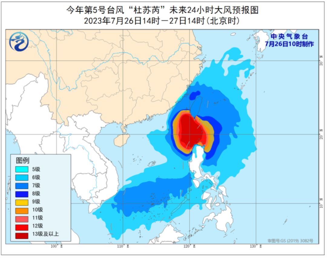 中央气象台预计,26日14时至27日14时,巴士海峡、台湾以东洋面、南海东北部和南部海域、台湾海峡、东海南部,以及台湾岛及其沿海、福建沿海将有6至8级大风、阵风9至10级,其中巴士海峡、南海东北部偏东海域、台湾海峡偏南海域、台湾岛南部沿海风力可达9至12级、阵风13至15级,“杜苏芮”中心经过的附近海域风力可达13至17级,阵风17级以上。