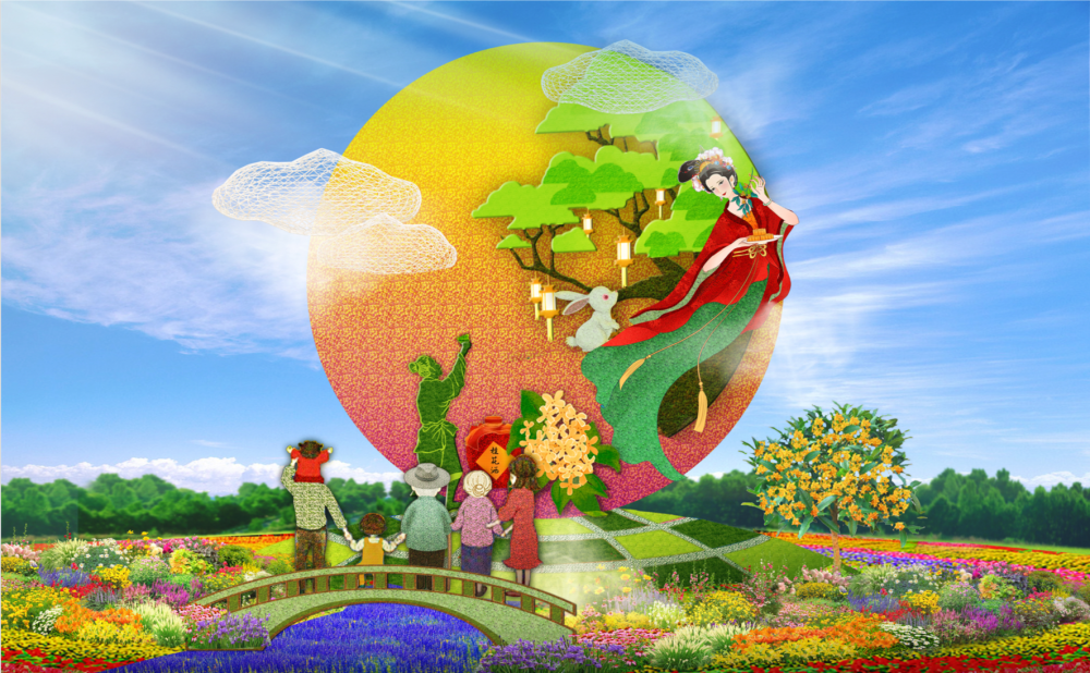国庆假期与中秋假期“喜相逢”,今年的花坛里自然少不了中秋元素。西单西北角正布置“花好月圆”花坛。“这个花坛描述的场景是一家人在中秋团聚。”蓝海浪说,“一个花坛浓缩万家灯火,道出花好月圆。”