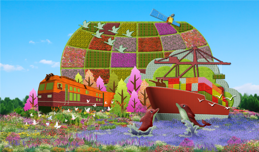 蓝海浪告诉记者,去年12月底便已启动2023年国庆花坛的设计,每一个花坛、花坛里每一处细节,都需反复考究、打磨,确保充分展现时代特征、年代特色。“‘一带一路’题材也是今年花坛设计的一大亮点。”今年恰逢共建“一带一路”十周年。在西单东南角,“幸福之路”花坛以中欧班列、货轮以及海豚为主景,寓意共建共享、合作共赢。