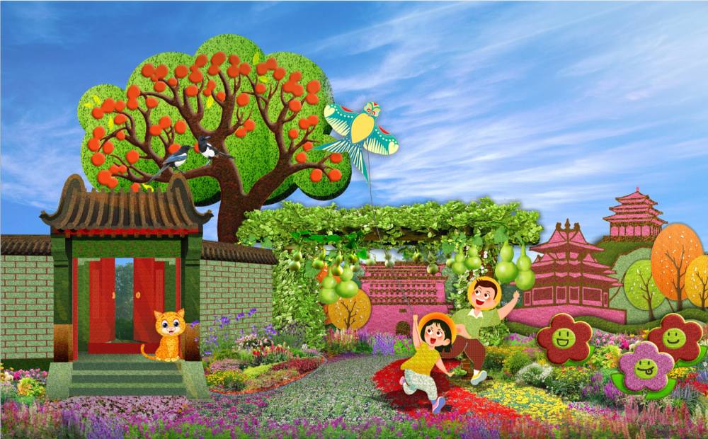 西单西南角“美好家园”花坛,以老北京胡同里的幸福生活为场景,配以放风筝的少年、柿子树、中轴景观等,展现人民幸福生活的新图景。