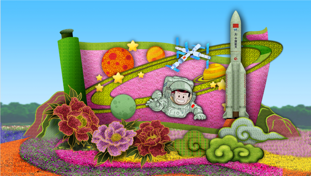复兴门东北角“筑梦未来”花坛,以中国航天员、空间站为主景,讲述航天强国建设蓬勃发展,寓意更加绚丽美好的明天。