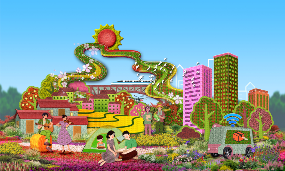 东单东南角“共同富裕”花坛,以欣欣向荣的城乡融合发展为场景,描绘了中国式现代化全体人民共同富裕的美好蓝图。