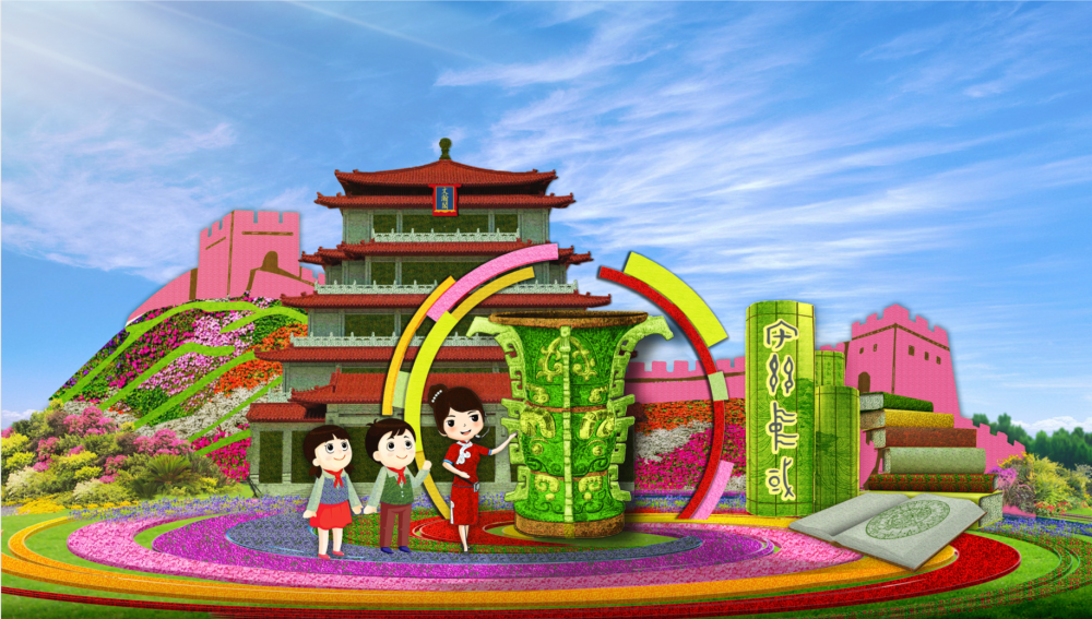 东单东北角“文明华章”花坛,以国宝文物何尊、“宅兹中国”文字、国家版本馆等为背景,寓意中华文明赋予中国式现代化以深厚底蕴,在古为今用中赓续中华文明,走向更开阔未来。