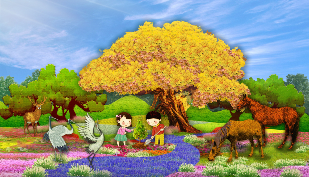 东单西北角“和谐共生”花坛,以“三北工程”绿色长城为主景,配以野马(西北)、麋鹿(华北)、白鹤(东北)、胡杨等典型动植物,寓意坚定不移走好人与自然和谐共生的中国式现代化之路。