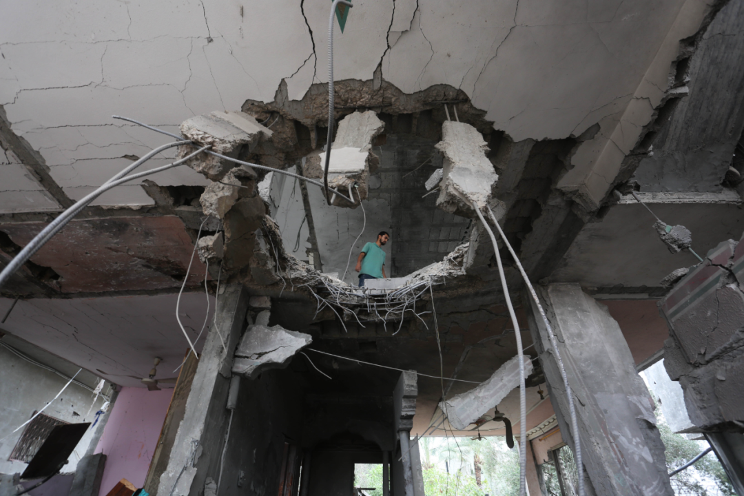 10月29日,在加沙地带南部城市拉法,一名男子查看被以军空袭损毁的建筑。新华社发(哈立德·奥马尔摄)