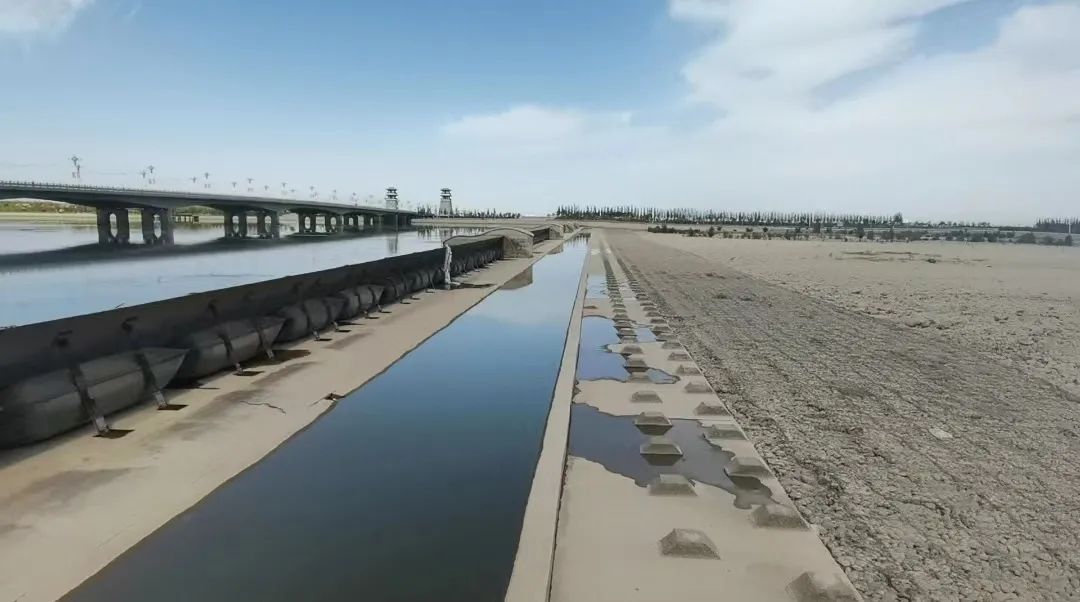 2023年8月24日,督察组前期暗查看到甘州区黑河新城大桥下游建设的橡胶坝在蓄水。(中央第四生态环境保护督察组供图)