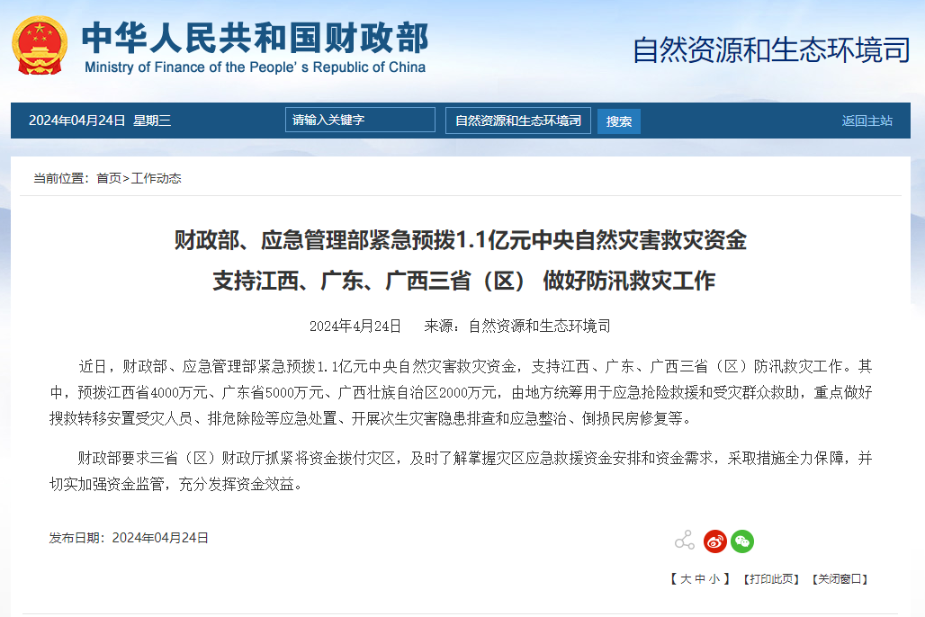 近日,财政部、应急管理部紧急预拨1.1亿元中央自然灾害救灾资金,支持江西、广东、广西三省(区)防汛救灾工作。其中,预拨江西省4000万元、广东省5000万元、广西壮族自治区2000万元,由地方统筹用于应急抢险救援和受灾群众救助,重点做好搜救转移安置受灾人员、排危除险等应急处置、开展次生灾害隐患排查和应急整治、倒损民房修复等。