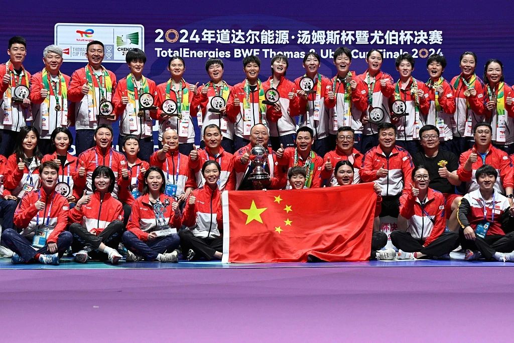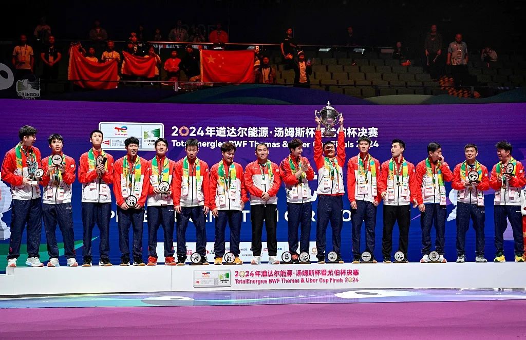 这是中国羽毛球队参赛历史上第11次捧起世界羽毛球男子团体锦标赛最高荣誉汤姆斯杯,也是继2012年后,再次同时包揽汤姆斯杯和尤伯杯双冠。