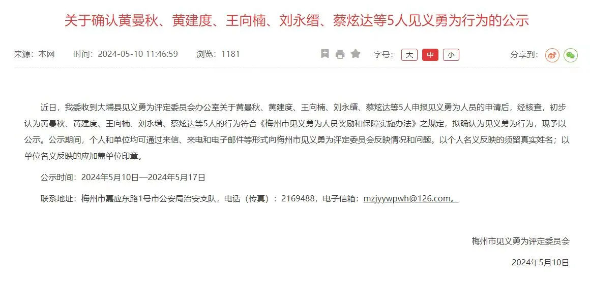 近日,广东梅州市人民政府发布公示,拟确认黄曼秋、黄建度、王向楠、刘永缙、蔡炫达等5人见义勇为行为。公示时间为5月10日至5月17日。