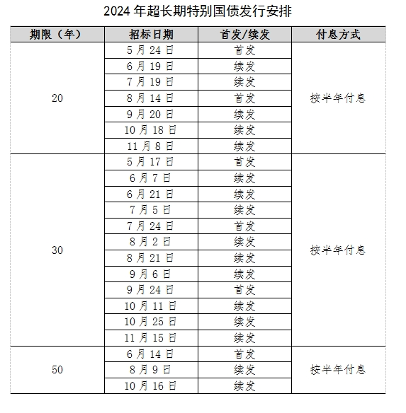 根据此次发布的通知,今年拟发行超长期特别国债的期限分别为20年、30年、50年,首次发行时间为5月17日,11月中旬发行完毕。