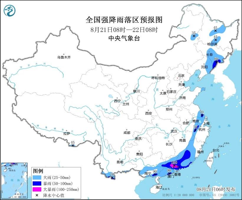 中央气象台8月21日06时发布暴雨蓝色预警: