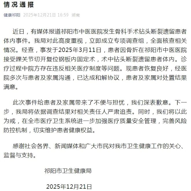 近日,有媒体报道祁阳市中医医院发生骨科手术钻头断裂遗留患者体内事件。祁阳市卫生健康局对此高度重视,立即成立专项调查组,全面核查相关情况。经查,事发于2025年3月11日,患者因骨折在祁阳市中医医院接受踝关节切开复位钢板内固定术,术中钻头断裂遗留患者体内。诊疗过程中院方存在违反相关医疗制度等问题。现患者恢复良好,经医院多次与患者及家属沟通,已达成和解协议,患者及家属对处置结果满意。